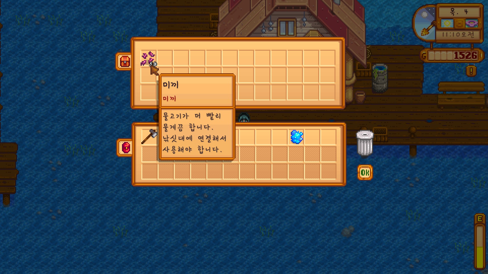 아까 얻은 미끼를 낚싯대에 끼워보려 하지만 방법을 알지 못해 헤매는 모습이 담겨 있다.