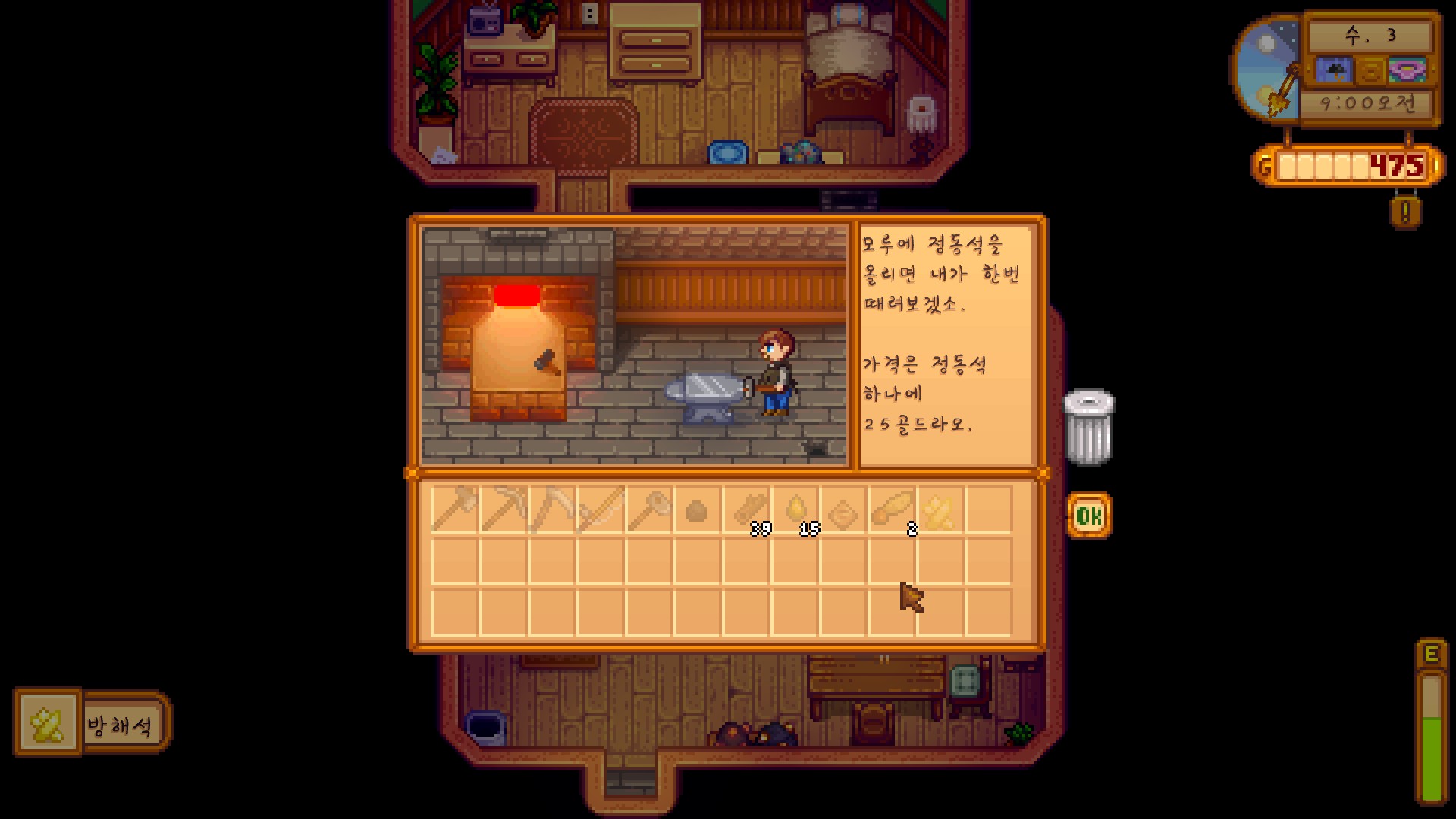 오픈 시각에 딱 맞춰 대장간에 도착한다. 대장장이에게 정동석을 맡겨보도록 하자.