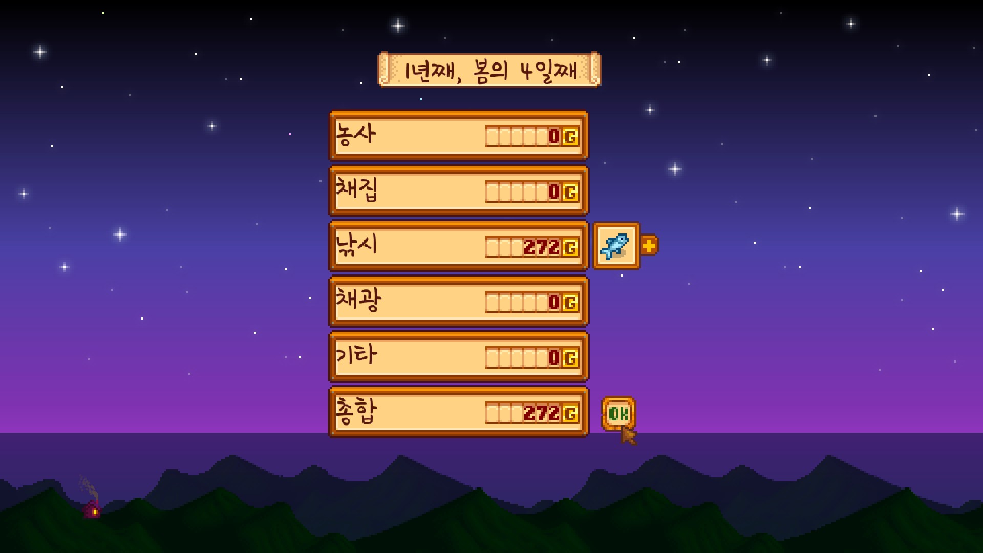 그리고 하루의 정산. 낚시 레벨이 올랐고, 물고기를 판 돈을 받았다.