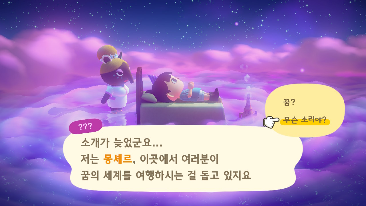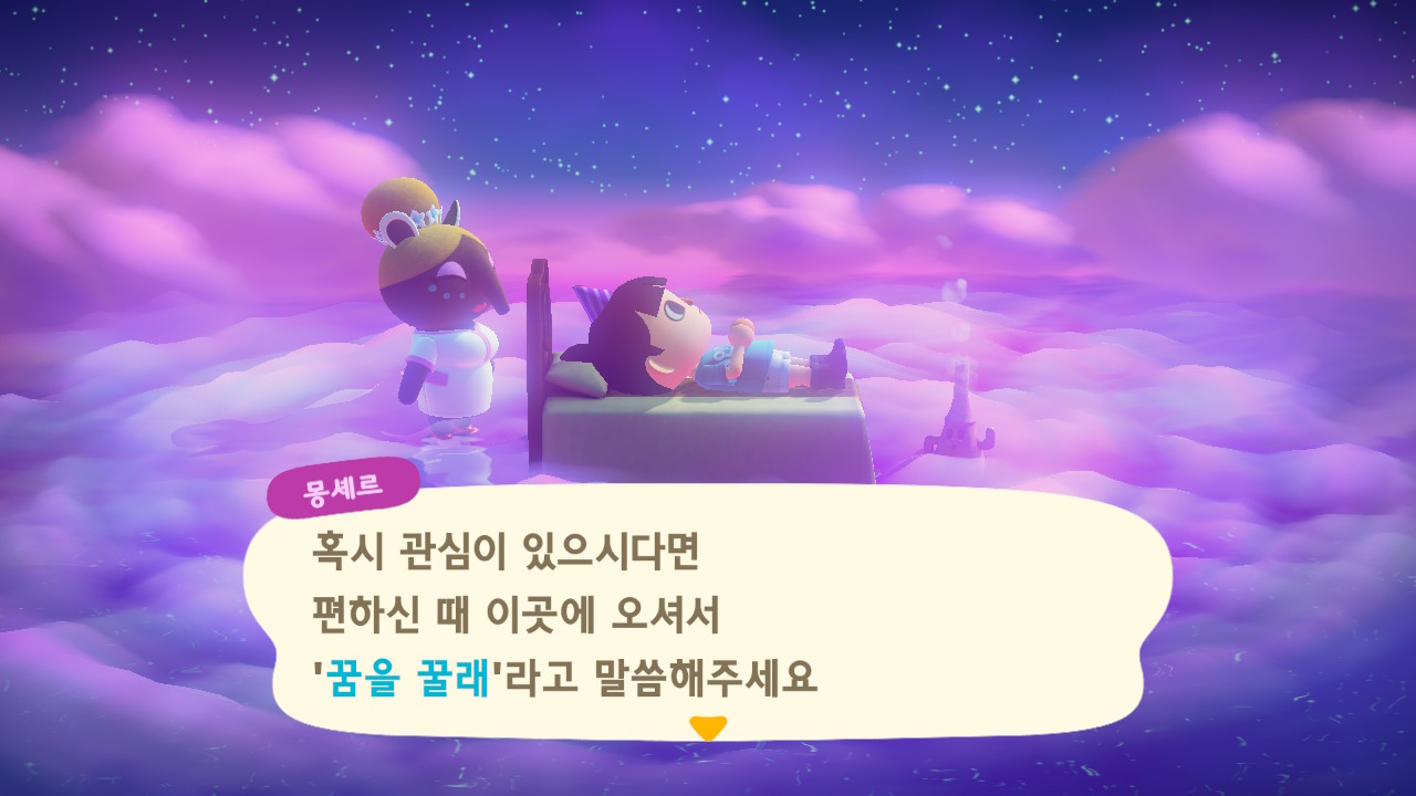 그녀에게 모동숲의 '꿈' 시스템에 대한 설명을 듣고 잠에서 깨어난다.