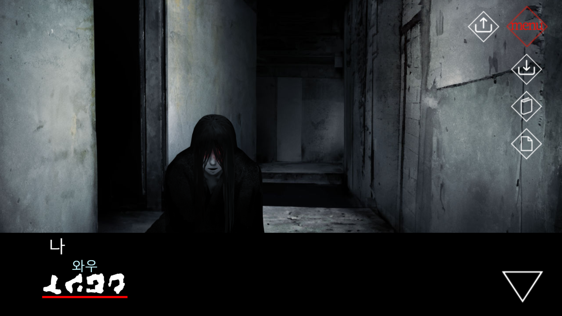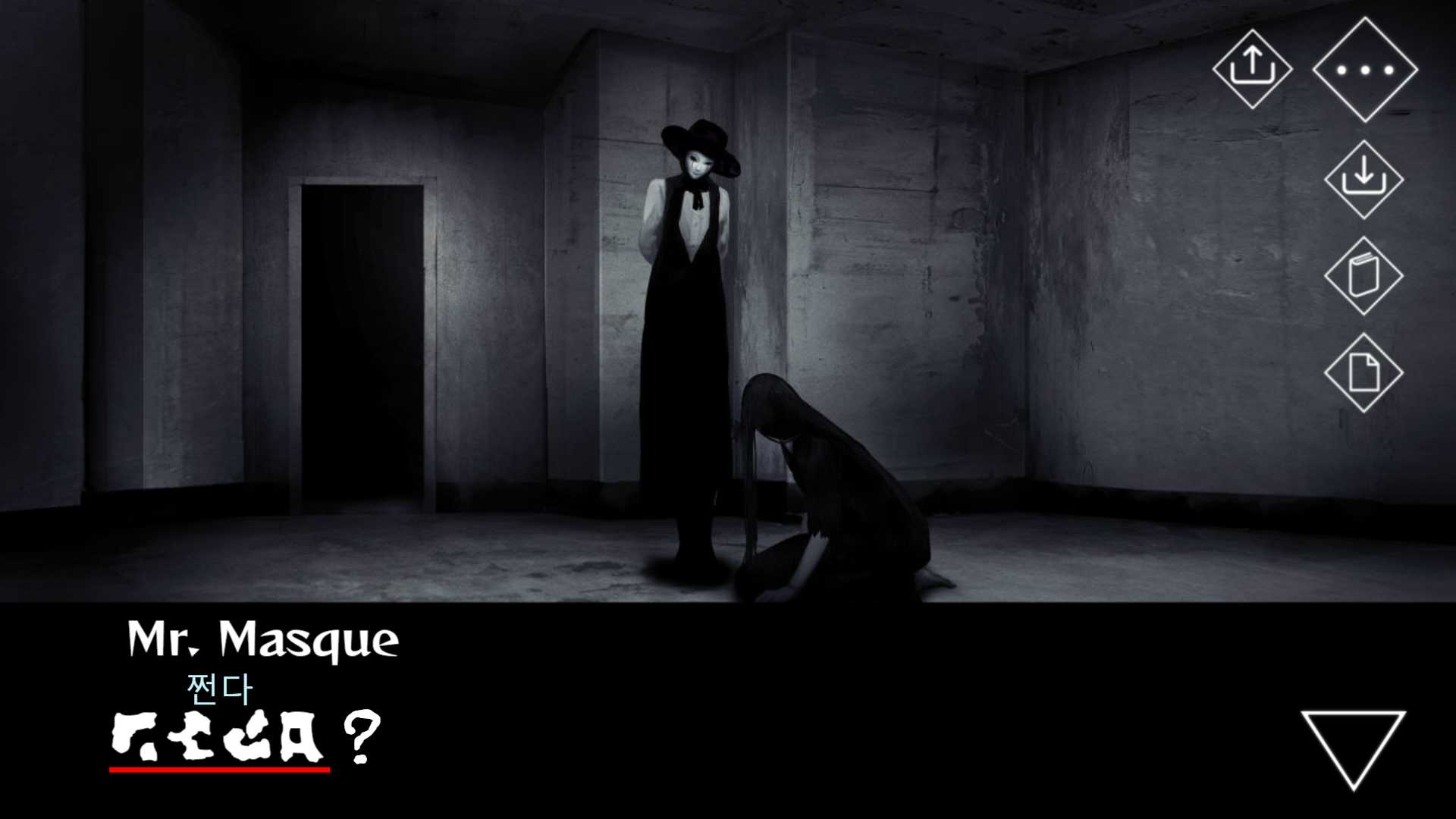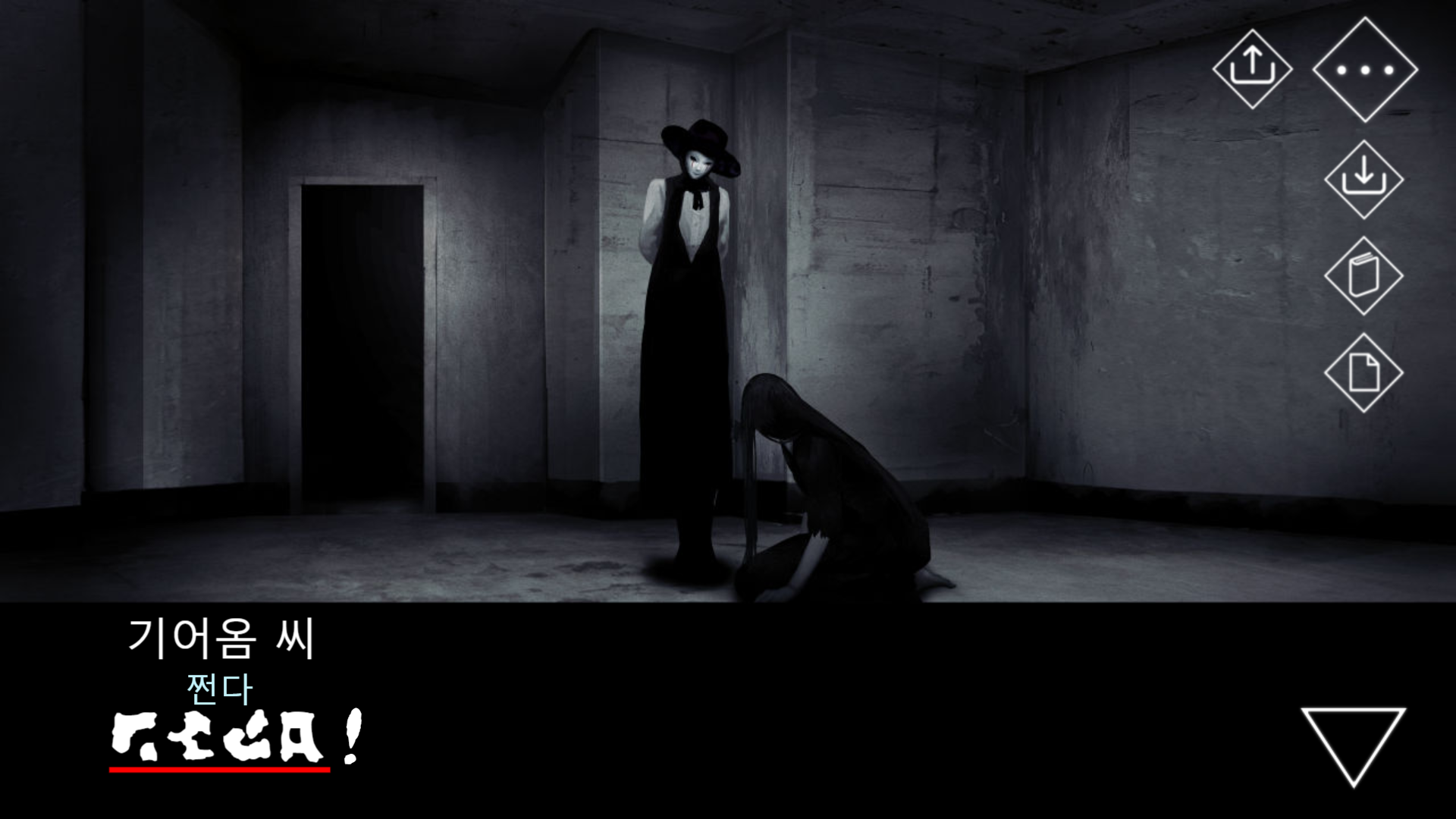 파란 옷을 입은 귀신의 방을 지나, 새로운 공간으로 넘어온 주인공과 기어옴 씨.