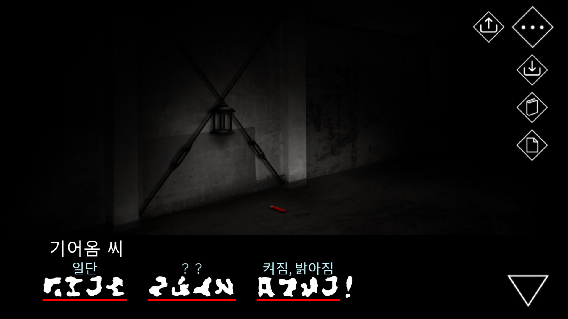 바닥에 떨어진 라이터를 주워 랜턴에 접근하도록 하자.