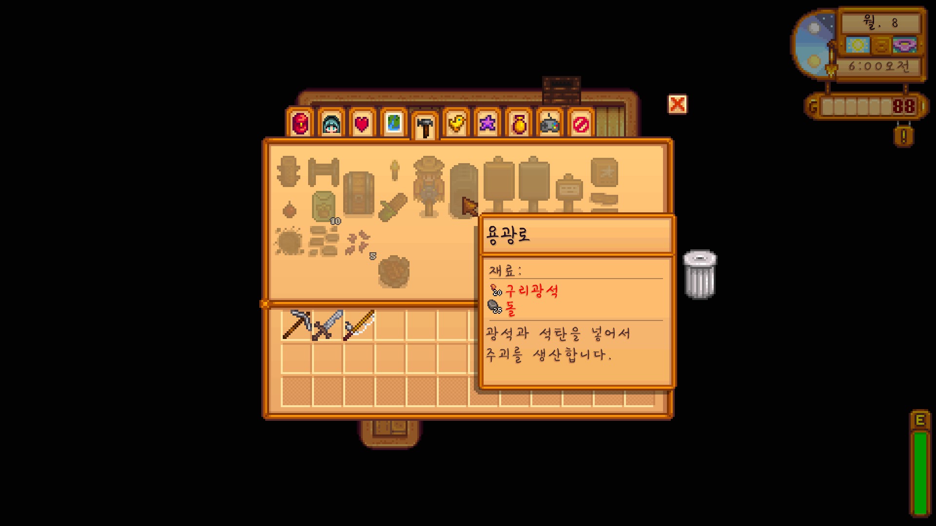구리 광석과 돌이 꽤 많이 필요한데 흔한 재료이니 만드는 데까지 그렇게 오래 걸리지는 않을 것 같다.