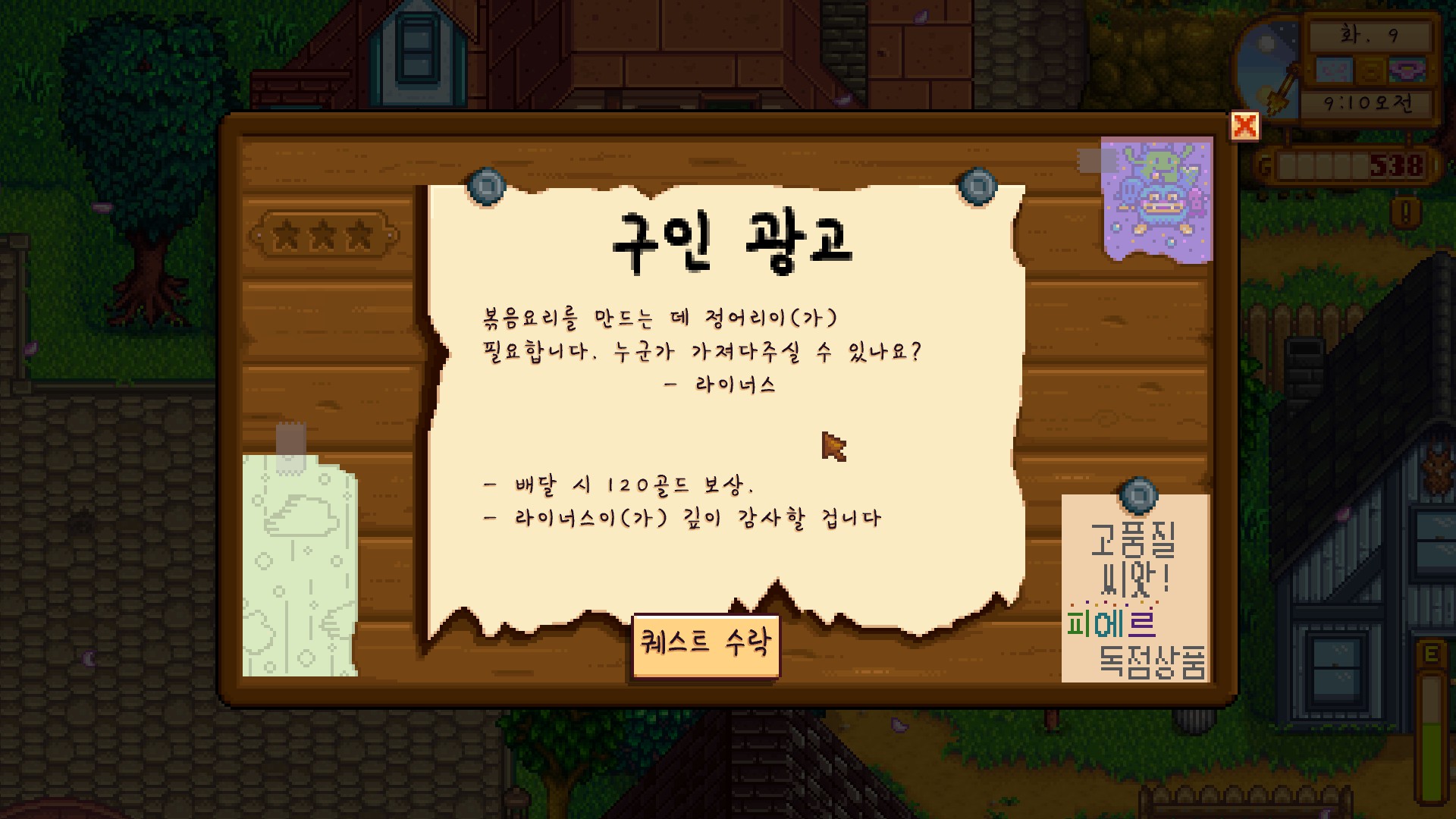 마을에 붙어 있는 퀘스트의 목표는 장어.